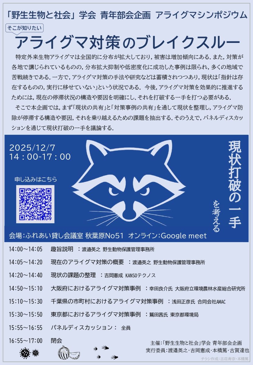 当社研究員がアライグマの管理に関する学会シンポジウムを企画、登壇します。